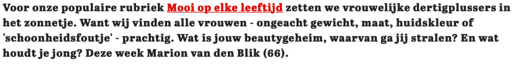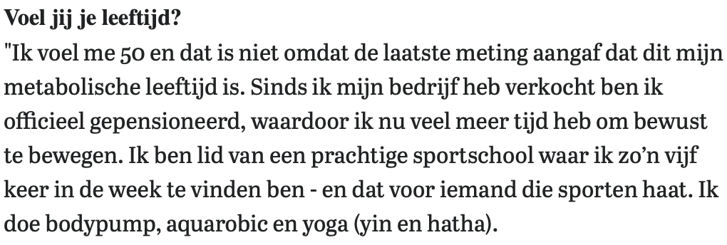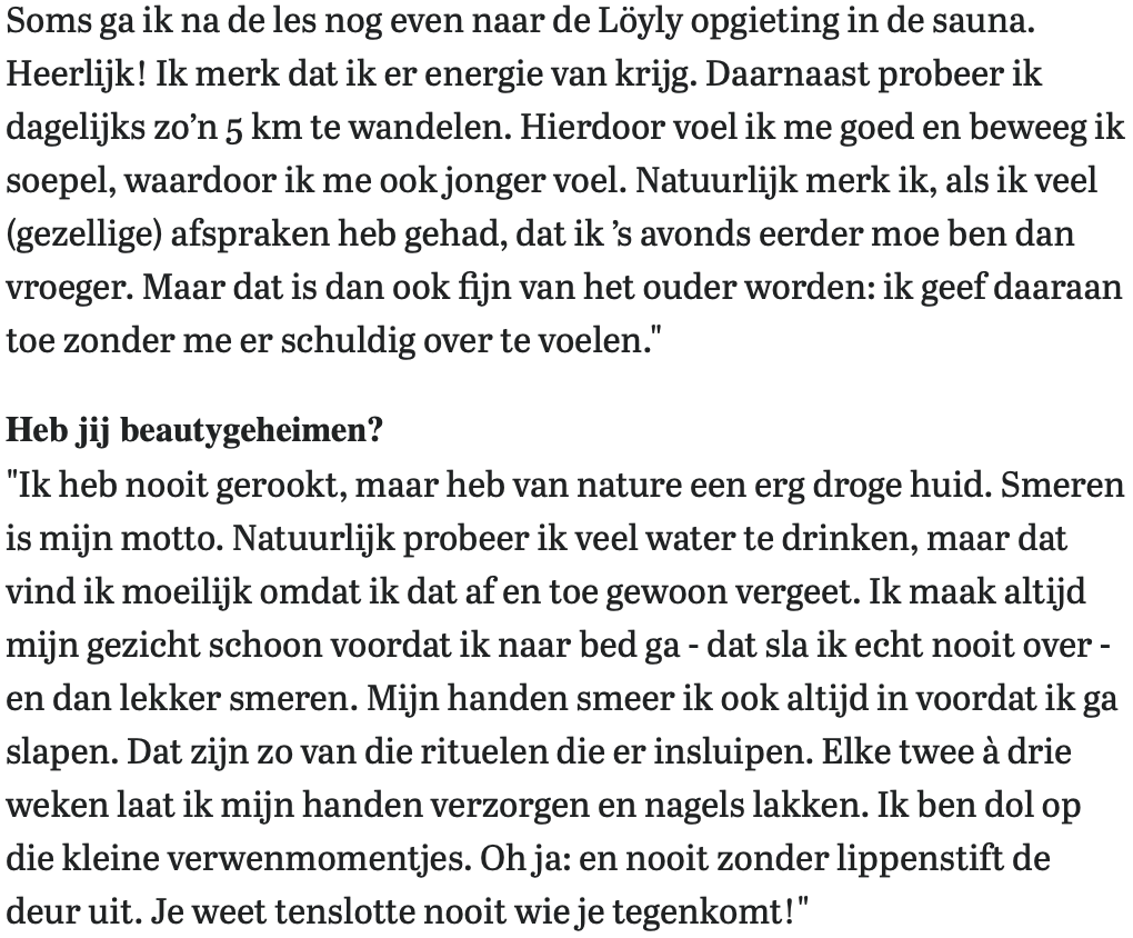 I feel 50, and it’s not because the last measurement indicated that’s my metabolic age. Since I sold my business I am officially retired, which means I now have much more time to exercise consciously. I am a member of a wonderful gym (Caesar Sport in The Hague) where I can be found about five times a week. I do bodypump, aqua aerobics and yoga (yin and hatha). Sometimes I go to the Löyly sauna after class. Lovely! I notice that it gives me energy. I also try to walk about 5 km every day. This also makes you feel good and move smoothly, which also makes you feel younger. Of course I do notice when I have had a lot of (cozy) appointments, that I am more tired in the evening than I used to be. But then that’s also nice about getting older: I give in to that without feeling guilty about it.