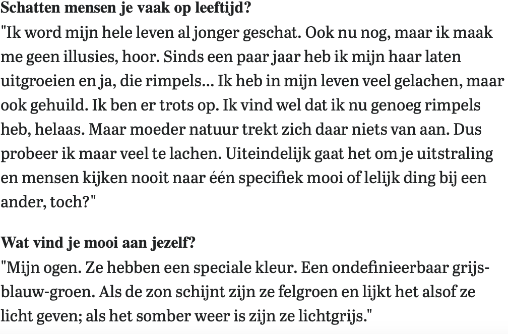 I have been estimated younger all my life. Even now, but I have no illusions. I’ve let my hair grow out since a few years and yes those wrinkles… I’ve laughed a lot in my life, but also cried. I am proud of it. I do think I have enough wrinkles now, unfortunately. But then again, Mother Nature doesn’t care. So I try to laugh a lot. In the end, it’s all about your appearance and people never look at one specific beautiful or ugly thing in another person. Right?