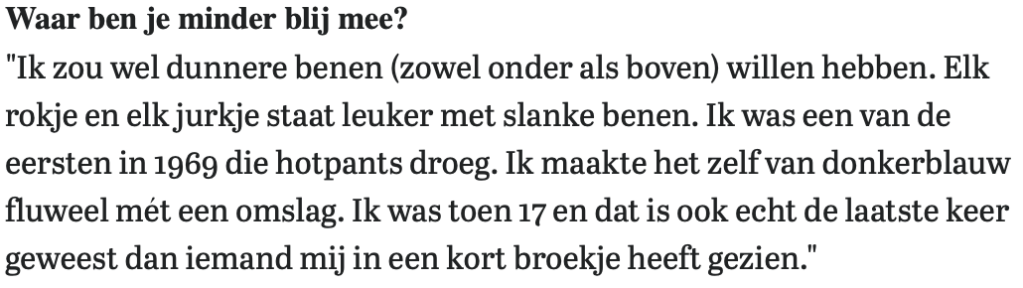 I do wish I had thinner legs (both below and above). Any skirt, any dress looks nicer with slim legs. I was one of the first in 1969 to wear hotpants. I made it myself out of dark blue velvet with a wrap. I was 17 at the time and that was really the last time anyone saw me in shorts.