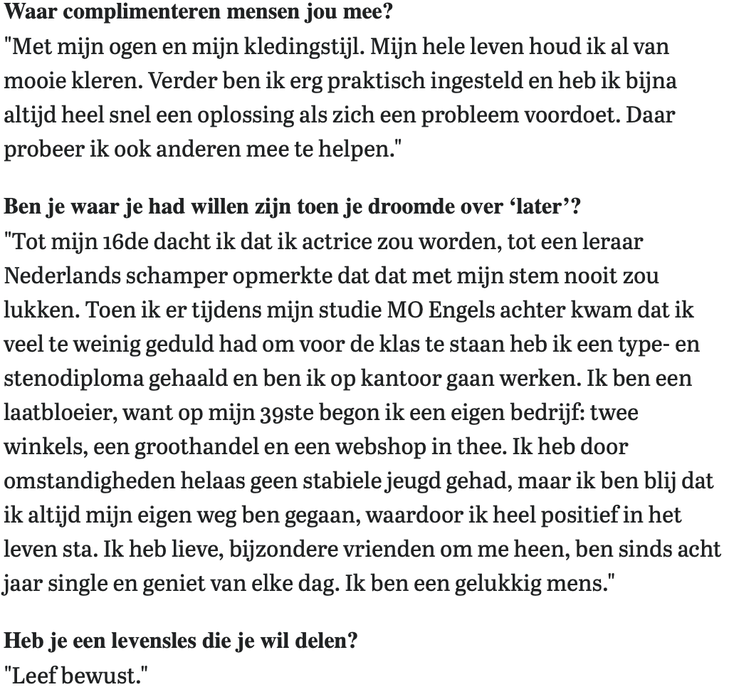Until I was 16 I thought I would become an actress until a Dutch teacher scornfully remarked that with my voice that would never work. When I found out while studying MO English that I had far too little patience to be in front of the class, I got a typing and shorthand degree and started working in an office. I am a late bloomer because at 39 I started my wonderful business: two stores, a wholesale business and a web shop in tea. I unfortunately did not have a stable childhood due to circumstances, but I am glad that I have always gone my own way which makes me very positive in life. I have dear, special friends around me; I have been single for eight years; I enjoy every day. I am a happy person.