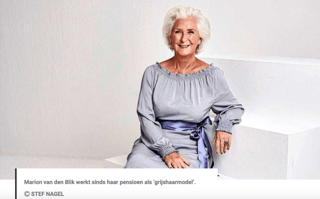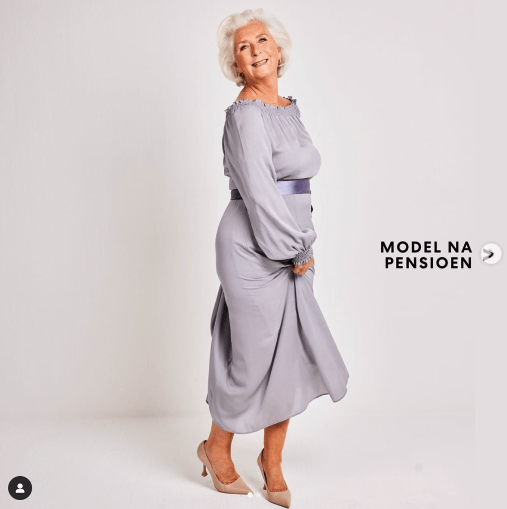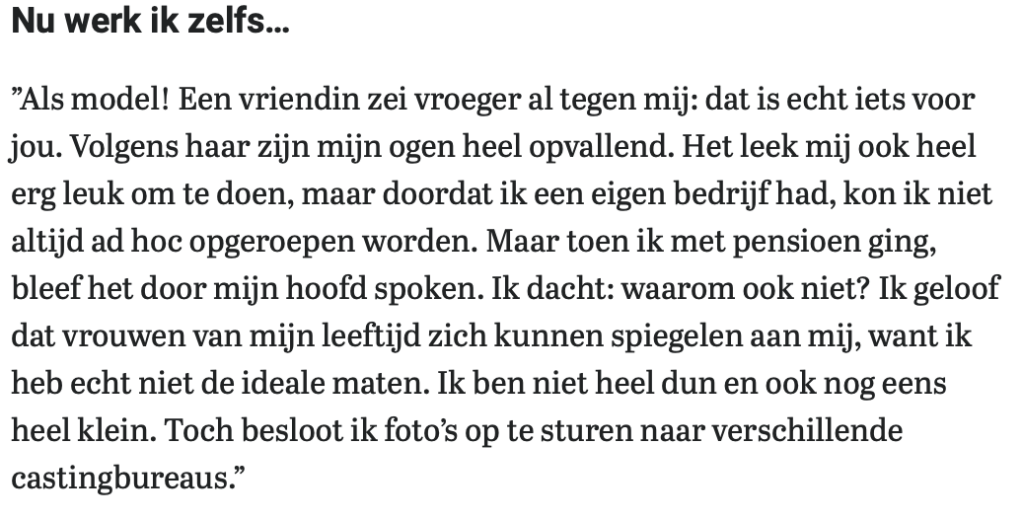 “As a model! A friend used to say to me: that’s really something for you. According to her, my eyes are very striking. I also thought it would be great fun to do, but because I had my own business, I couldn’t always be called on ad hoc. But when I retired, it kept running through my mind. I thought: why not? I believe women my age can emulate me, because I really don’t have the ideal measurements. I am not very thin and also very small. Nevertheless, I decided to send photos to several casting agencies.