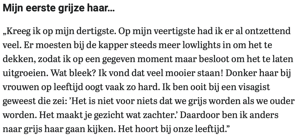 Got it at the age of 30. By the age of 40, I had an awful lot of it. The hairdresser had to put in more and more lowlights to cover it, so at one point I just decided to let it grow out. As it turned out? I thought it looked much better! Dark hair on older women often looks so harsh. I once went to a make-up artist who said: ‘There’s a reason we turn grey when we get older. It softens your face a bit.’ That made me look at grey hair differently. It’s part of our age.”