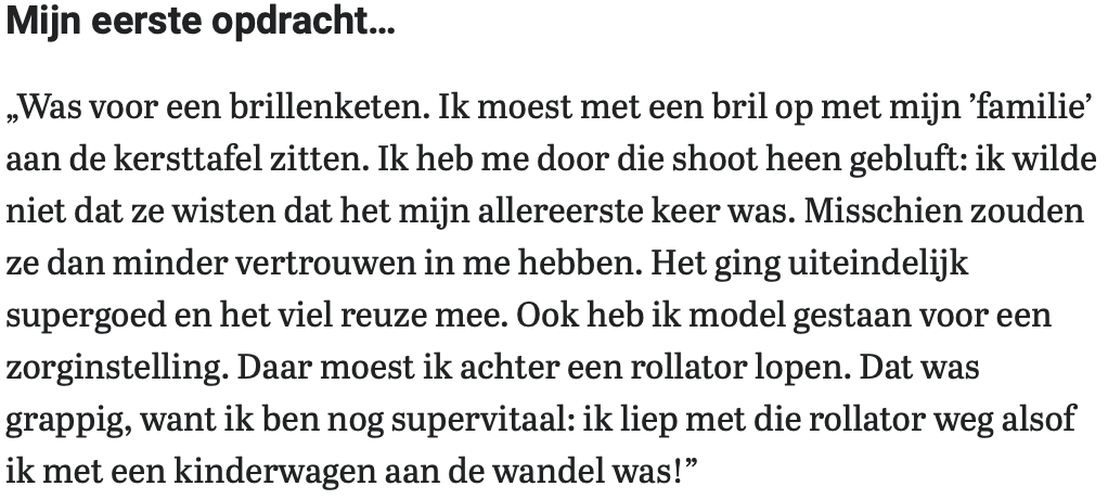 “Was for an eyewear chain. I had to sit at the Christmas table with my ‘family’ wearing glasses. I bluffed my way through that shoot: I didn’t want them to know it was my very first time. Maybe then they would have less confidence in me. It went super well in the end and was not too bad. I also modelled for a care facility. There, I had to walk behind a walker. That was funny, because I am still super vital: I walked away with that walker as if I were walking with a pram!”