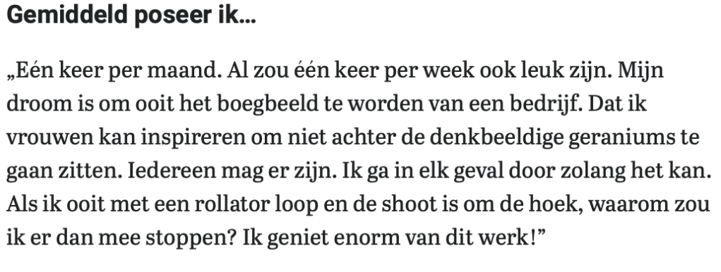 “Once a month. Although once a week would be nice too. My dream is to one day become the figurehead of a company. That I can inspire women not to sit behind the imaginary geraniums. Everyone is allowed to be there. In any case, I will continue as long as I can. If one day I am walking with a walker and the shoot is around the corner, why would I stop? I enjoy this work immensely!”